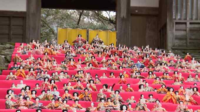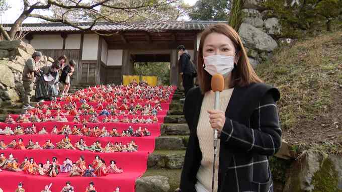 筑前の小京都、福岡県朝倉市の秋月で始まったひなめぐり。秋月城跡ではシンボルの長屋門へ続く24段の石段に、約600体のひな人形が3年ぶりに飾られました。