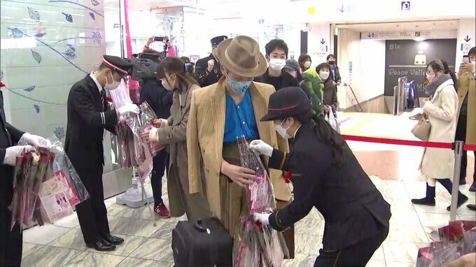 2月14日はバレンタインデーです。博多駅では、利用客への感謝の気持ちを込めて、駅長たちがバラをプレゼントしました。