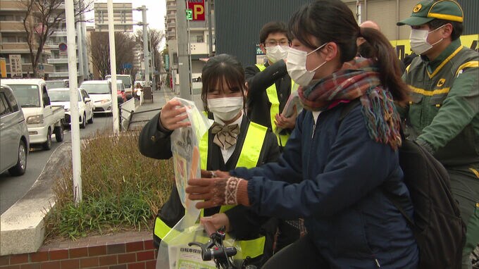 福岡市早良区の荒江交差点では17日午前7時すぎから、高校生や警察官など約20人がチラシを配りながら、自転車のヘルメット着用などを呼びかけました。