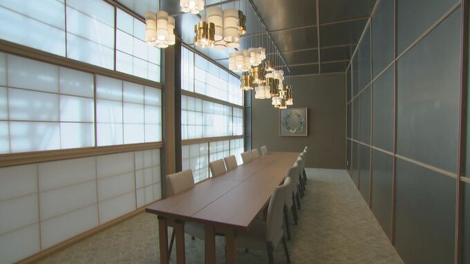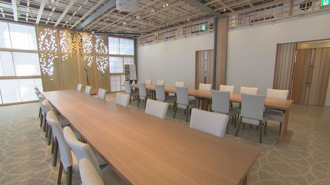 櫛田神社の北神門の隣に完成した「宮前迎賓館灯明殿」。ガラス張りの建物は地上4階建てで延床面積は1250平方メートルあります。館内には各種宴会や展示会などさまざまなシーンで利用できるよう4つの宴会場が用意されていて、最も広い部屋は最大100人まで入れます。