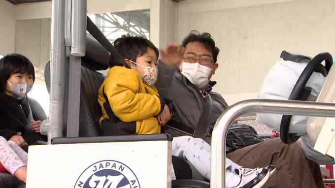 佐賀市で子供たちが乗り込んだのは、時速5キロで車が衝突した際の衝撃を体験できる「模擬衝突体験車」。