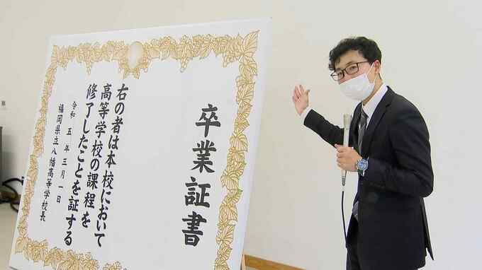北九州市八幡東区の八幡高校に現れた、巨大な卒業証書。縦横いずれも約2メートルで、ちょうど名前が書かれる場所に、人が立って写真を撮れるようになっています。