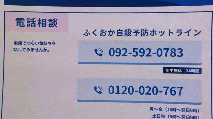 厚生労働省は、悩みの相談先として「よりそいホットライン」など複数の窓口を紹介している。また福岡県も、24時間無休で対応する「ふくおか自殺予防ホットライン」で相談を受けている。