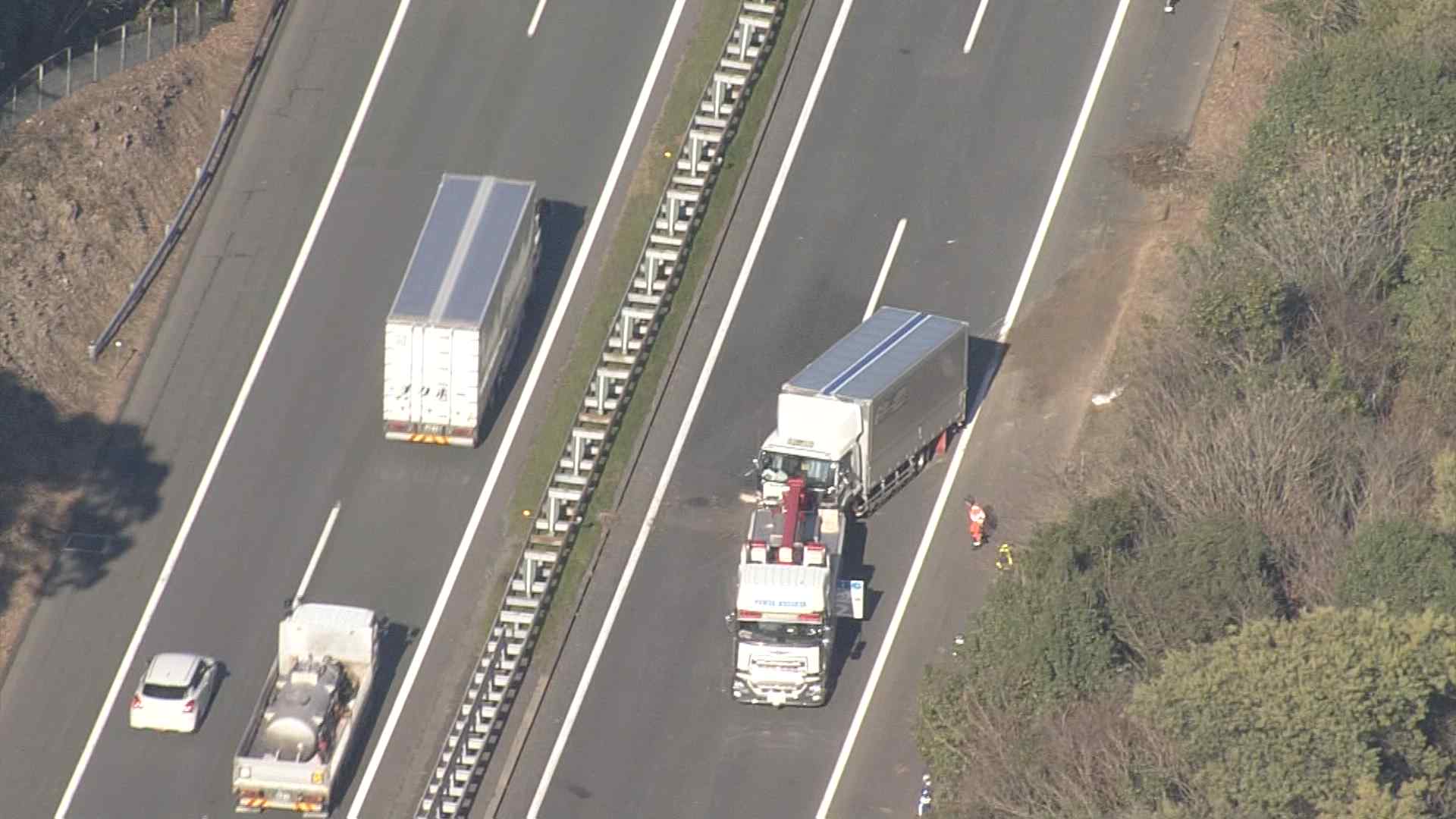 28日午前5時半ごろ、宮若市水原の九州道上り線で中型のトラック2台が衝突し、1台は車体がひっくり返り、もう1台は横転しました。男性2人が病院に運ばれましたが命に別状はないということです。