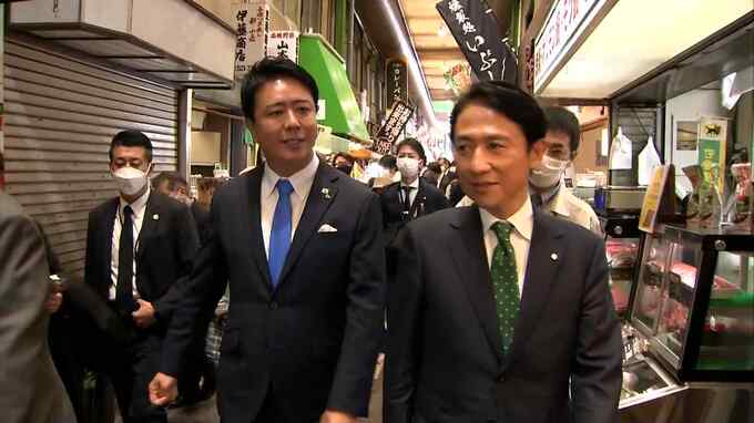 がっちりと握手を交わした福岡市の高島宗一郎市長と北九州市の武内和久市長。会談を前に2人が視察したのは、去年、2度の火災に見舞われた小倉北区の旦過市場です。今年4月から営業が始まる仮設店舗の建設が進むエリアで、復興状況について説明を受けました。