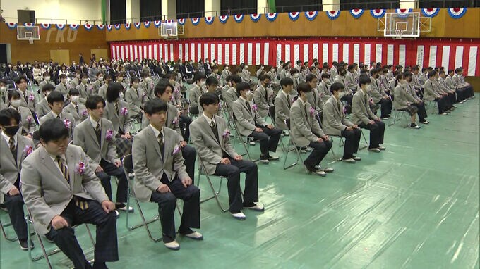 福岡市博多区の沖学園高校の卒業式では、国が示した方針などを受けて、マスクを外すかどうかの判断を卒業生それぞれに委ねられました。その結果、約半数の生徒が外して式に臨みました。高校は保護者の参加を去年まで1人に制限したものの、今年は2人までに緩和しました。