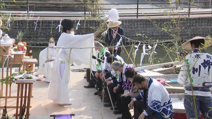 福岡県柳川市隅町の特設会場ではけさ、川下りの事業者や観光協会の関係者など約40人が集まり、どんこ舟2隻で作った祭壇に1年間の安全を祈願しました。新型コロナウイルスが流行して以降、「お堀開き」は神事のみ執り行われていましたが、今年は4年ぶりに川下りを実施するなど柳川に活気が戻ってきました。