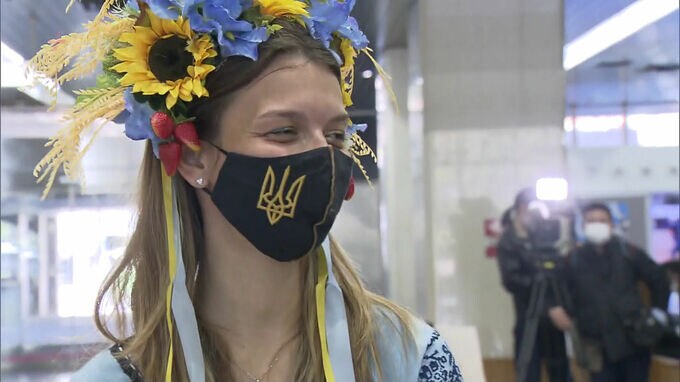 エカテリーナさんは、ウクライナの国の花であるひまわりをあしらった髪飾りをつけて販売を呼びかけました。