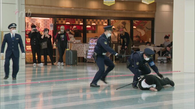 福岡空港で行われたテロ対策合同訓練には、警察や税関、出入国在留管理局のほか、民間の警備会社が参加しました。訓練は偽造パスポートを所持した国籍不明の男が、入国審査の途中に逃走したという想定で男の身柄を確保するまでの手順を確認しました。また、拳銃を持っている別の男を警察が取り押さえる訓練も実施されました。