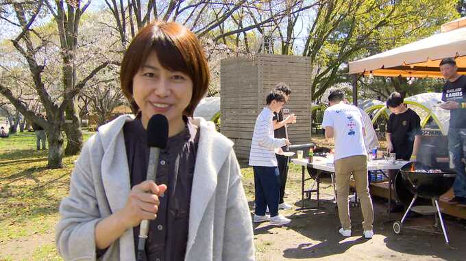 RKB堤千春「舞鶴公園のバーベキュースペースです。お花見とバーベキューを楽しんでいらっしゃいますが、どうやら野球も気になるようです」