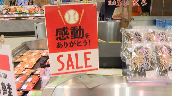 来店客「うれしいですね。おめでとうと言いたい。試合見てからきました」「少しでも安いなら(うれしい)」