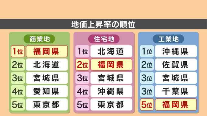 「工業地」もコロナ前を上回る6.6%の上昇率となりました。福岡空港に近い「福岡市東区二又瀬新町」は、地価が去年より18.1%上がりました。全国トップクラスの上昇率です。物流施設用地の需要が堅調であることが要因とみられています。2023年の「公示地価」で福岡県全体の上昇率は「商業地」が全国1位、「住宅地」は全国2位、「工業地」は5位となっています。