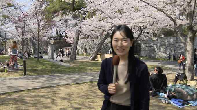 RKB下濱美有「小倉城の桜も満開も迎えています。去年と違って、皆さん思い思いの場所にレジャーシートを敷いて花見を楽しんでいます」