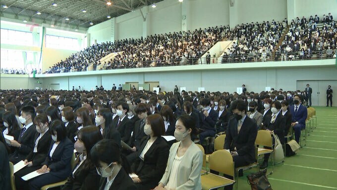 新型コロナの影響で去年までは学部ごとに式典が行われていましたが、今年はマスクを着用した上で、4年ぶりに新入生全員が一堂に会しました。