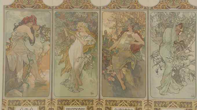 ミュシャの作品の中でも人気を博したのが、春夏秋冬を女性の姿に置き換えた装飾パネルのシリーズ《四季》です。装飾パネルは、油彩画と比べて値段が安く気軽に購入できたため、多くの人が部屋に飾って楽しんだそうです。