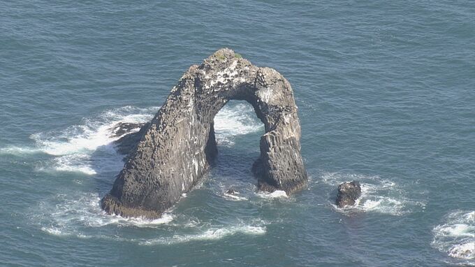 相島の岬の突端に、「めがね岩」という大きな岩があります。突端から100メートルぐらい沖の海に、高さ20メートルぐらいの大きな岩で、潮に侵食されて、きれいにくり抜かれています。琴を引く時、琴柱(ことじ)という音階を調整する三角形の部品がありますよね。あんな形をしています。