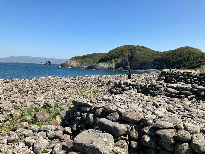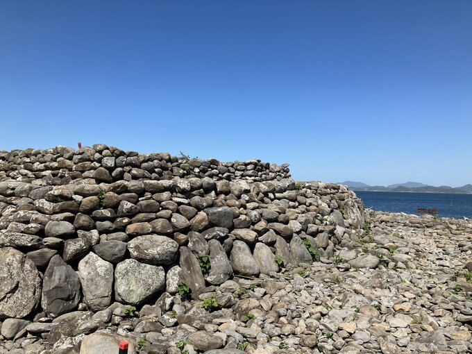 海岸は砂浜ではなく、石だらけなんですが、そこからちょっと引いたところに、石積みの古墳が塚のようになっていて、それがいっぱいあるんです。海岸線に沿って約500mにわたって、254基の石積みの塚がずらりと並んでいました。これが、国指定史跡の「積石塚群(つみいしづかぐん)」です。