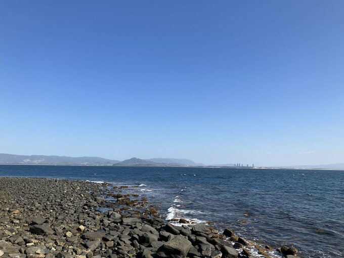 古墳群に立つと、目の前に浜辺の石がずらーっと広がっていて、右の方には岩の岬(鼻面半島)があり、その先の海の中に、眼鏡のような形の岩が立っています。対岸は、福間・津屋崎が見える。宗像族の拠点です。