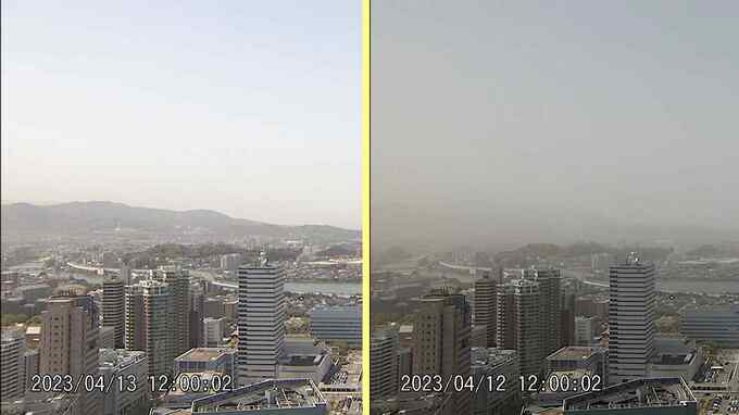 情報カメラで12日と13日の同じ時間帯を比較してみました。どちらも奥の景色がかすんでいますが、12日は山がほとんど見えません。福岡では12日深夜から未明にかけても黄砂が飛来したため、タクシー会社の運転手は早朝から洗車に追われました。