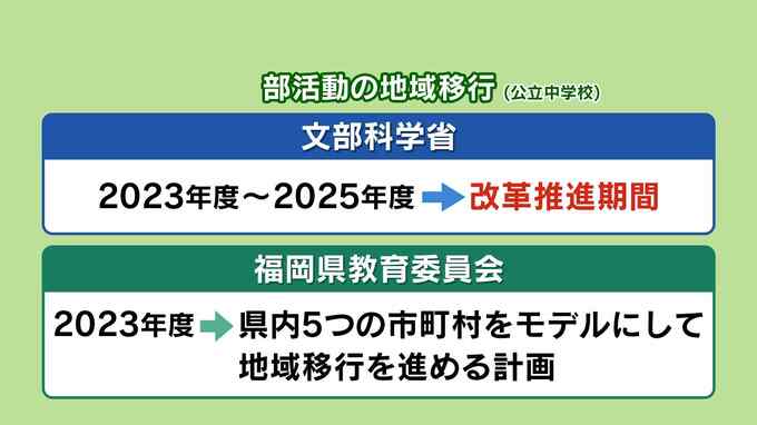 深刻な教員の長時間労働、要因の一つとなっているのが部活動です。教員の働き方改革の一環として、文部科学省は今年度から公立中学校の部活動の休日指導を、地域のスポーツクラブなどに委ねる「地域移行」に取り組みます。3年間を移行に向けた「改革推進期間」と位置づけていて、福岡県教育委員会も今年度から県内5つの市町村をモデルにして、地域移行を進める計画です。