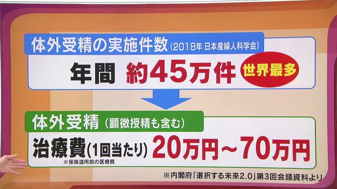 国内の体外受精の実施件数は、年間およそ45万件とされていてこの数字は世界最多となります。内閣府の資料によると不妊治療の平均費用は体外受精でおよそ20万円から70万円。しかし、1回の治療で妊娠に結び付くとは限りません。ですのでかなりの経済負担になります。