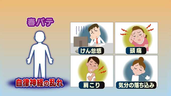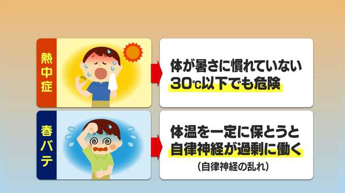 この時季は体がまだ暑さに慣れていないため、30度以下でも熱中症に注意しないといけません。さらに体温を一定に保とうと自律神経が過剰に働くため、「春バテ」にも注意が必要です。「春バテ」は倦怠感、頭痛、肩こり、気分の落ち込みなどが主な症状となっています。