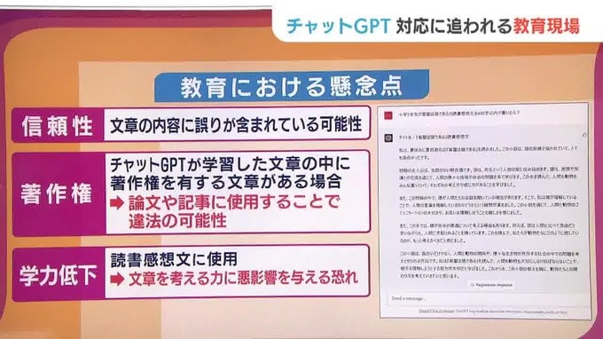 今後の学習にも影響を与える可能性が高いChatGPT。「読書感想文など指示を入れただけで簡単に書けるので使ってみたいと思った」「自分で考えることができなくなるのではないか」など生徒の間でも意見は様々。保護者は「便利なツールは親の時代にはなかったので親も対応が大変。宿題は自分でしてほしい」「便利でいいことだと思うが、頼りすぎるのはこれからの時代怖い」「今からパソコンを勉強するので悪いことを覚えなければいいなと思う」と子どもの学習に不安を抱いているようです。