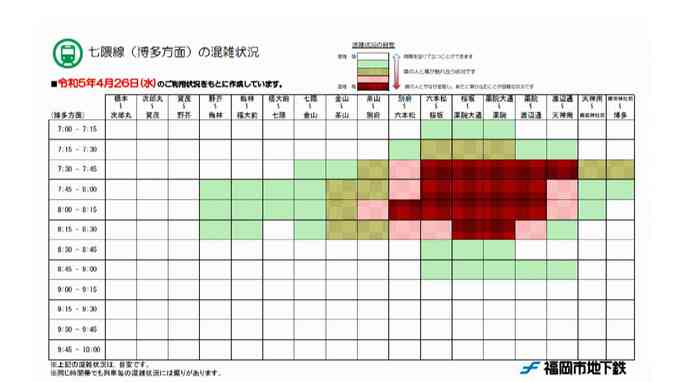 先月27日に天神南駅から博多駅までの延伸区間が開業した福岡市地下鉄七隈線。市によると、七隈線の利用客は延伸前1週間の平均と比べて平日で53%増加、地下鉄全体の利用客は平日で4%増加したという。車両が小さい七隈線は、朝の通勤・通学時間帯に混雑が目立つようになった。博多方面に向かう別府から天神南の16区間で26日、乗車率が140%以上になった。