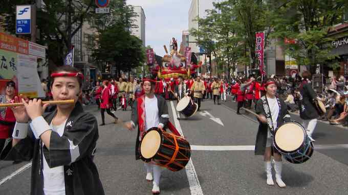 福岡市内29か所に設けた演舞台では、2日間で577団体、6000人ほどが、歌や踊りなどを披露します。また、午後のパレードは、2日間で去年の約2倍の1万6000人あまりが参加する予定で、コロナ禍前の8割まで戻りました。去年は、市民や観光客に観覧を控えるよう呼びかけたパレード会場の明治通り沿いも、多くの見物客で埋まりました。マスクの着用は個人の判断に委ねられ、口元まで笑顔を見せてパレードを満喫する出演者や観客の姿も見られました。