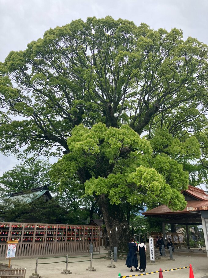 取材に訪れたのは「みどりの日」の5月4日。樹齢1000年とも言われる御神木、楠の大木から黄緑色の新芽が色鮮やかに萌え出ていました。