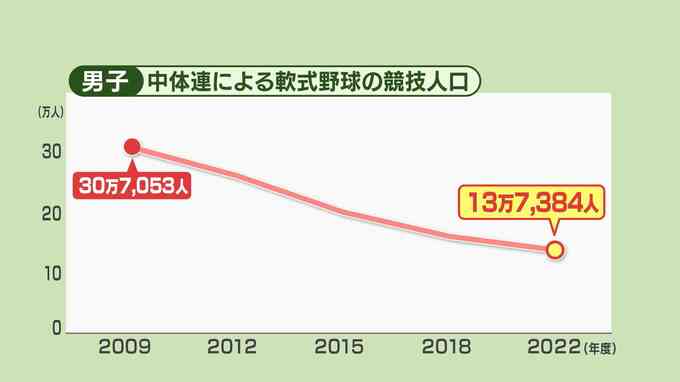 スポーツ庁が調べた中体連の競技人口によると、軟式野球をする子供は2009年度に約30万人いましたが昨年度は約14万人に減少しました。