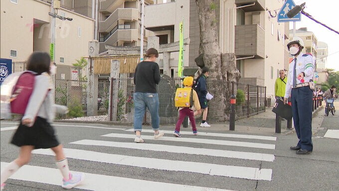 福岡県内の通学路約60か所では12日、警察官350人態勢で登下校の時間帯に合わせた交通取締が実施されました。このうち、福岡市南区の交差点では、警察官約10人がスピード違反などを取り締まるとともに子供たちの登校を見守りました。