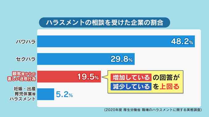 厚生労働省が制作した「カスハラ」動画です。コンビニの店員が客に暴言を吐かれ威圧的な態度で脅されています。厚生労働省が3年前に実施した調査によると、職員から「ハラスメント」の相談を受けた企業の割合は「パワハラ」48.2%、「セクハラ」29.8%。次いで「カスハラ」が19.5%に上りました。その内訳を見ると、「増加している」が「減少している」を「カスハラ」だけが上回っているのです。