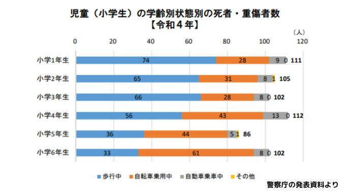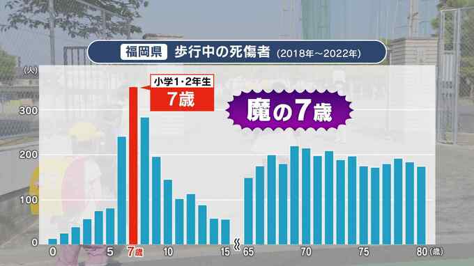 警察庁が公表した2022年の小学生の死傷・重傷者。高学年になるにつれ自転車の事故が増え、合計ではどの学年も100人前後で大きな差はありません。しかし、「歩行中」に限ると小学1年生が最多の74人で、6年生の2倍以上です。事故の多さから「魔の7歳」と呼ばれています。事故が起きやすいのが登下校の最中です。福岡市内で撮影した登校の様子です。黄色い帽子を被った新1年生が保護者に付き添われて学校に向かっていました。