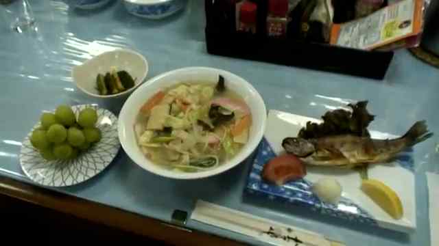 RKB久間直樹「これはチャンポン、こちらは海の上ですけどニジマス。そしてキュウリのキムチ、マスカット、ボリュームあります」