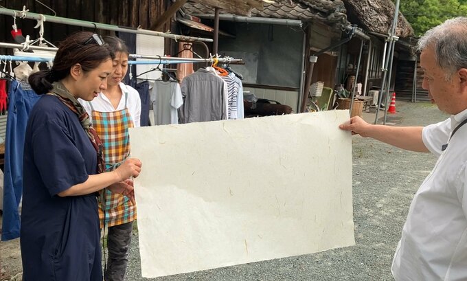 渡邉:もうなったんです、この前。1週間前にやっとできました。和紙屋さんに行って、「できますか」と聞いて。上の方の葉っぱをどろどろに溶いて、下の茎は溶けないので叩いて砕いて、すき込んでもらって。