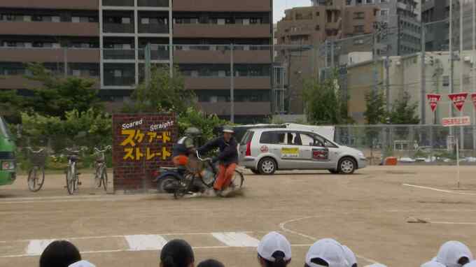 先週、福岡市博多区の高校で開かれた自転車の安全教室。プロのスタントマンが、実際に起きやすい事故を再現しました。