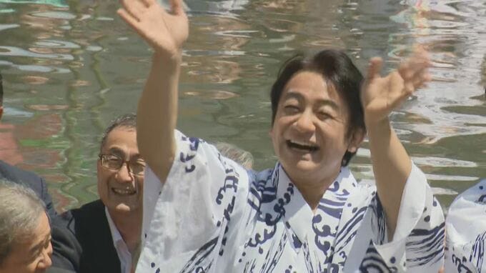 川岸のファンが歌舞伎俳優の屋号を呼んだり、紙吹雪をまいたりすると出演者は笑顔で手を振っていました。「博多座大歌舞伎」は、来月3日に開幕し19日まで上演されます。