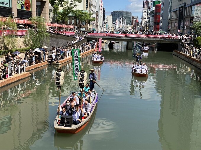 「六月博多座大歌舞伎」の出演者たちは31日午後「船乗り込み」を前にキャナルシティ博多で式典に臨みました。その後、近くを流れる博多川に移動した一座はおよそ3万人のファンが見つめる中、4年ぶりとなる「船乗り込み」に臨みました。