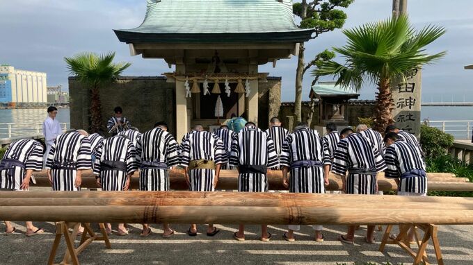 福岡市博多区の櫛田神社では午前7時ごろ、八番山笠・上川端通の男たち約20人が集まり、1本が約80キロある舁き棒をトラックに積んで、海辺の浜宮(はまみや)へ運びました。神職のおはらいを受けた後、男たちは6本の舁き棒を海水で洗い清め、祭りの期間中の安全を祈願しました。