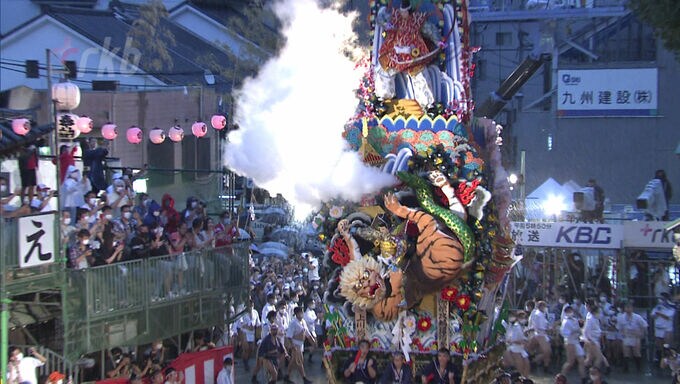 上川端通の山笠は、高さ約12メートルの走る飾り山笠として知られ、追い山笠で披露する仕掛けが見どころの1つになっています。