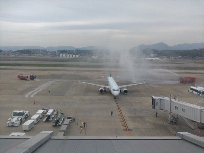 就航したのは春秋航空の福岡~上海便です。5日午後4時半ごろ予定より30分ほど早く福岡空港に第1便が到着すると消防車による放水=ウォーター・サルートで歓迎されました。