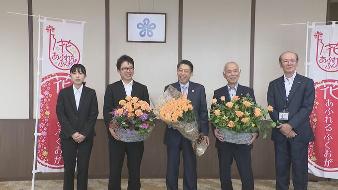 福岡県庁を訪れたのは花の生産者でつくる福岡県花き園芸連合会のメンバーで、服部知事にオレンジ色のバラ「カルピディーム+」の花束を贈りました。プレゼントされた「カルピディーム+」は、ラテン語で「今を大切に」という意味です。服部知事は「今このときを大切にしながら全力で仕事をしていく」とコメントし感謝の意を伝えました。