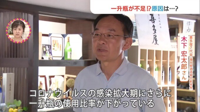 その理由として、福岡県酒造組合副会長であり「喜多屋」7代目の木下宏太郎さんは、一升瓶の使用量が年々低下しており、特に飲食店での使用が減っていると説明。さらに、新型コロナウイルスの感染拡大により、一升瓶の使用比率が一層下がっているとのことです。