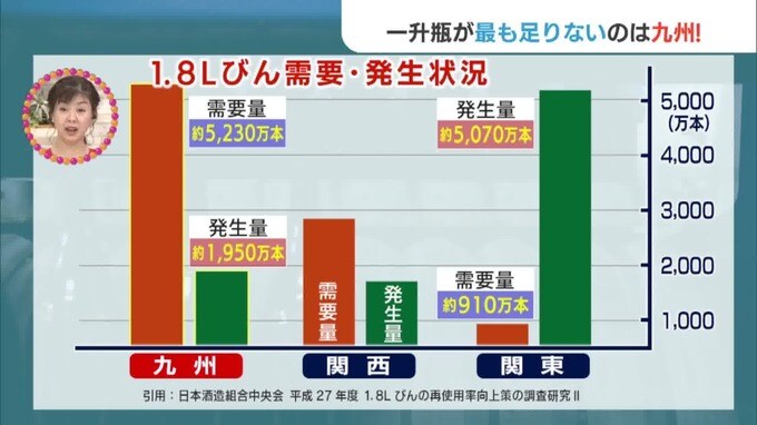 エリア別で一升瓶の数を比較したグラフをみると、関東エリアでは多くの消費者がおり空き瓶の発生量が突出している一方、九州では一升瓶の需要が非常に高くなっています。つまり、九州では全国各地からの空き瓶の供給が不可欠な状況にあり、特に九州地方では瓶の不足が深刻な問題となっているのです。