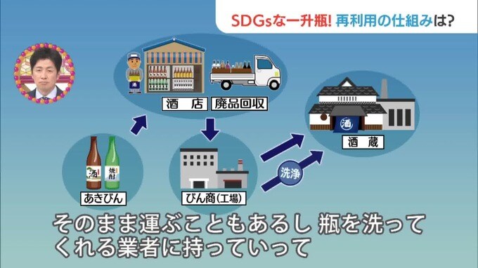 一升瓶はリターナブル瓶容器であり、ビール瓶と同じく繰り返し使用される「リサイクル認定」を受けた容器ですが、現在その状況が危機的な状況にあると木下さんは話します。