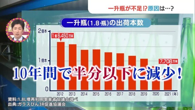 また、日本酒だけでなく、醤油やお酢なども一升瓶からペットボトル入りが主流となっていて、一升瓶の出荷本数も2012年の約1億6千万本から、2021年には約7700万本にまで減少しています。