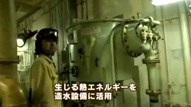 瀬戸口機関士「海水をヒーターに通して蒸発させ水滴にする。その水滴(蒸留水)に殺菌用の薬品とミネラル成分を入れて飲料水に」