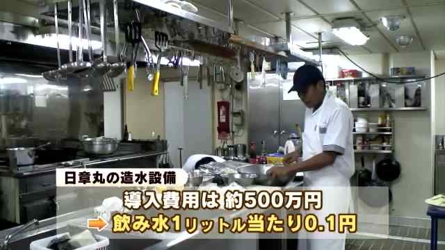 日章丸の造水設備は、海水を利用して1日に40トンの水を造ることができる。もっとも、1日に使う水は20トン弱で、大半がシャワーやトイレなどに使う雑用水だ。
