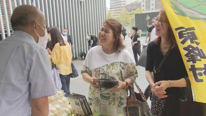 福岡市の博多駅前広場では14日、福島県と東峰村の「復興応援フェア」が開催されました。会場では、今が旬の福島県産のさくらんぼ「佐藤錦」や、東峰村のしいたけカレーなど約50種類の特産品を販売。開始直後から多くの人が買いに訪れていました。